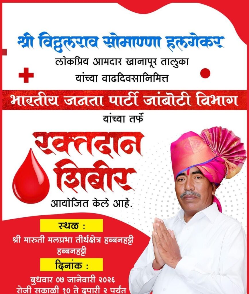 ಖಾನಾಪುರ : ಖಾನಾಪುರ ತಾಲ್ಲೂಕಿನ ಶಾಸಕ ಶ್ರೀ ವಿಠ್ಠಲರಾವ್ ಹಲಗೇಕರ್ ಅವರ ಜನ್ಮದಿನದ ಪ್ರಯುಕ್ತ ಭಾರತೀಯ ಜನತಾ ಪಾರ್ಟಿ ಜಾಂಬೋಟಿ ವಿಭಾಗದ ವತಿಯಿಂದ ಸಮಾಜಮುಖಿ ಚಿಂತನೆಯೊಂದಿಗೆ ಭವ್ಯ ರಕ್ತದಾನ ಶಿಬಿರವನ್ನು ಆಯೋಜಿಸಲಾಗಿದೆ.