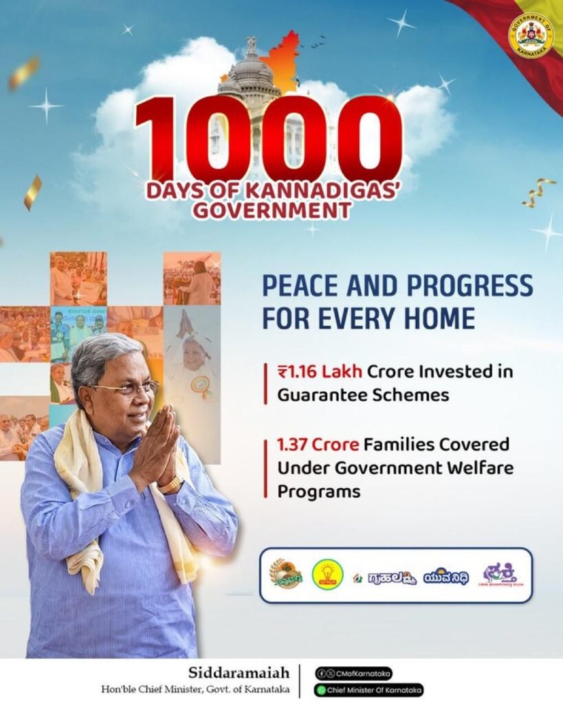 गोरगरीब, सामान्य, कष्टकरी, कामगार, शेतकरी आणि महिलांच्या उन्नतीसाठी यांच्या नेतृत्वाखालील राज्य सरकारने निवडणुकीत दिलेल्या आश्वासनानुसार राज्यभर पंचहमी योजना प्रभावीपणे राबविल्या आहेत. सुमारे 1000 दिवसांच्या कालावधीत पंचहमी योजनांसाठी राज्य सरकारने 1.16 लाख कोटी रुपये खर्च केले असून, या देशातील सर्वात मोठ्या कल्याणकारी योजनांपैकी एक असल्याचे त्यांनी नमूद केले. या योजनांचा राज्यातील सुमारे 1.37 कोटी कुटुंबांना थेट लाभ होत असल्याचा दावा त्यांनी केला. तसेच पंचहमी योजनांमुळे राज्याच्या दरडोई उत्पन्नात वाढ झाल्याचेही त्यांनी सांगितले.