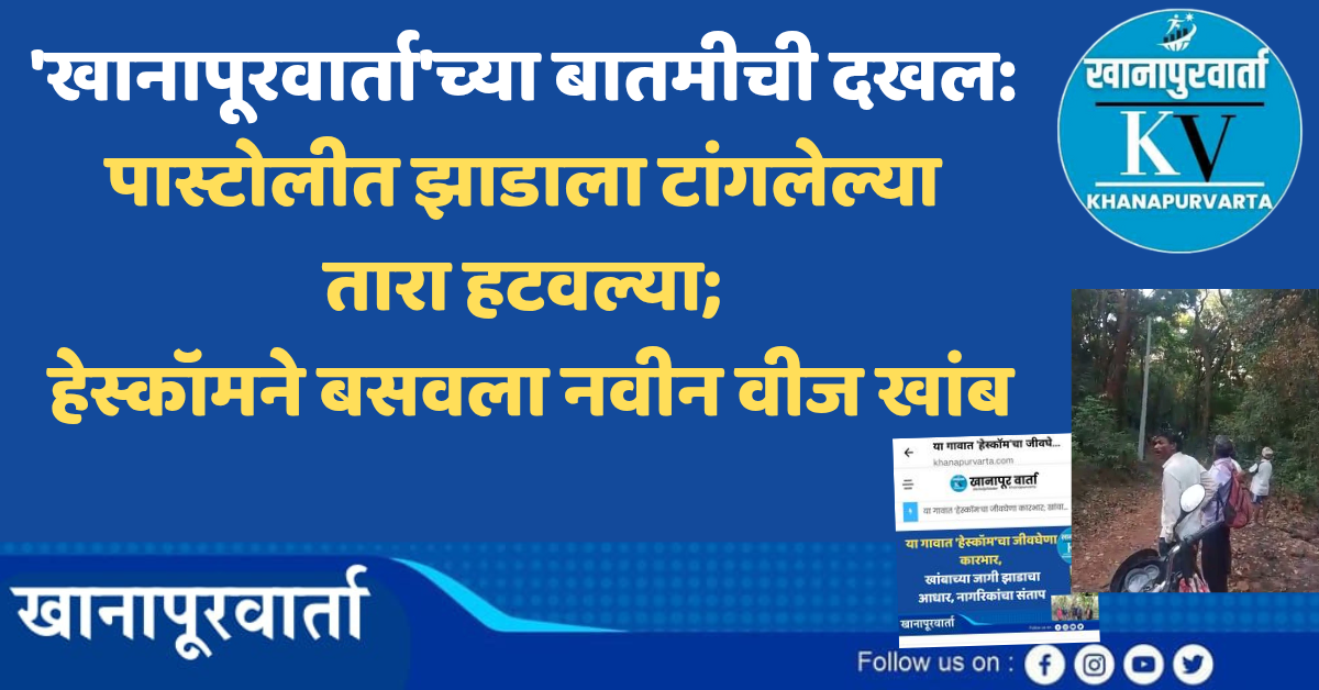 ‘खानापूरवार्ता’च्या बातमीची दखल: पास्टोलीत झाडाला टांगलेल्या तारा हटवल्या; हेस्कॉमने बसवला नवीन वीज खांब | ಖಾನಾಪುರ ವಾರ್ತೆ’ ಸುದ್ದಿಯ ಪ್ರಭಾವ: ಪಾಸ್ತೋಲಿಯಲ್ಲಿ ಮರಕ್ಕೆ ಕಟ್ಟಿದ್ದ ವಿದ್ಯುತ್ ತಂತಿ ತೆರವು; ಹೆಸ್ಕಾಂನಿಂದ ಹೊಸ ಕಂಬ ಅಳವಡಿಕೆ