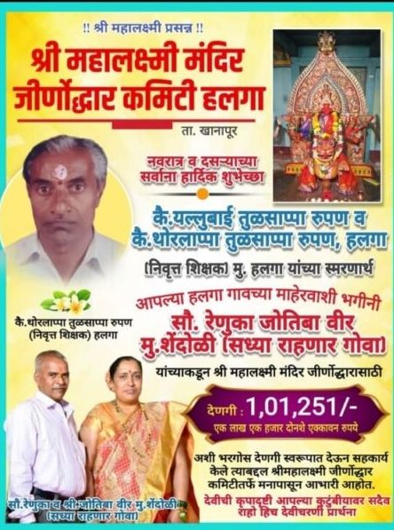 ಹಳಗಾ (ತಾ. ಖಾನಾಪುರ) : ಹಳಗಾ ಗ್ರಾಮದ ಕೇ. ಥೋರಲಪ್ಪ ತುಳಸಪ್ಪ ರೂಪಣ (ನಿವೃತ್ತ ಶಿಕ್ಷಕ) ಮತ್ತು ಕೇ. ಪಲ್ಲುಬೈ ತುಳಸಪ್ಪ ರೂಪಣ ಅವರ ಸ್ಮರಣಾರ್ಥವಾಗಿ, ಗ್ರಾಮದ ಮಾವನೂರಿನ ಸೌ. ರೇಣುಕಾ ಜೋತಿಬಾ ವೀರ (ಮು. ಶೇಂದೋಳಿ ಕುರುಡ್, ಪ್ರಸ್ತುತ ವಾಸ : ಗೋವಾ) ಇವರು ಶ್ರೀ ಮಹಾಲಕ್ಷ್ಮಿ ದೇವಾಲಯದ ಜೀರ್ಣೋದ್ಧಾರಕ್ಕಾಗಿ ₹೧,೦೧,೨೫೧/- ದೇಣಿಗೆ ನೀಡಿರುವರು.