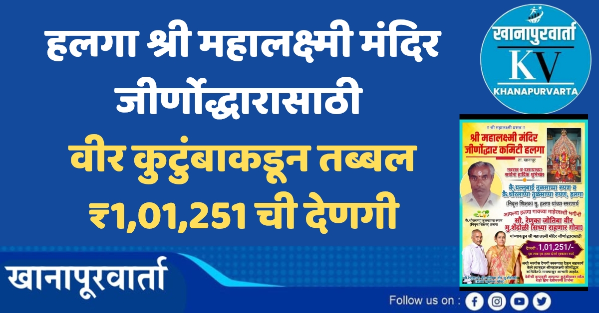 हलगा (ता. खानापूर): हलगा गावातील श्री महालक्ष्मी मंदिराचा जीर्णोद्धार करण्याच्या ग्रामस्थांच्या निर्णयाला माहेरवाशीण सौ. रेणुका जोतिबा वीर यांनी मोठे आर्थिक पाठबळ दिले आहे. त्यांनी आपल्या दिवंगत आजी व वडिलांच्या स्मरणार्थ मंदिर जीर्णोद्धार कार्यासाठी तब्बल 1,01,251/- (एक लाख एक हजार दोनशे एकावन्न रुपये) रुपयांची उदार देणगी अर्पण केली आहे.