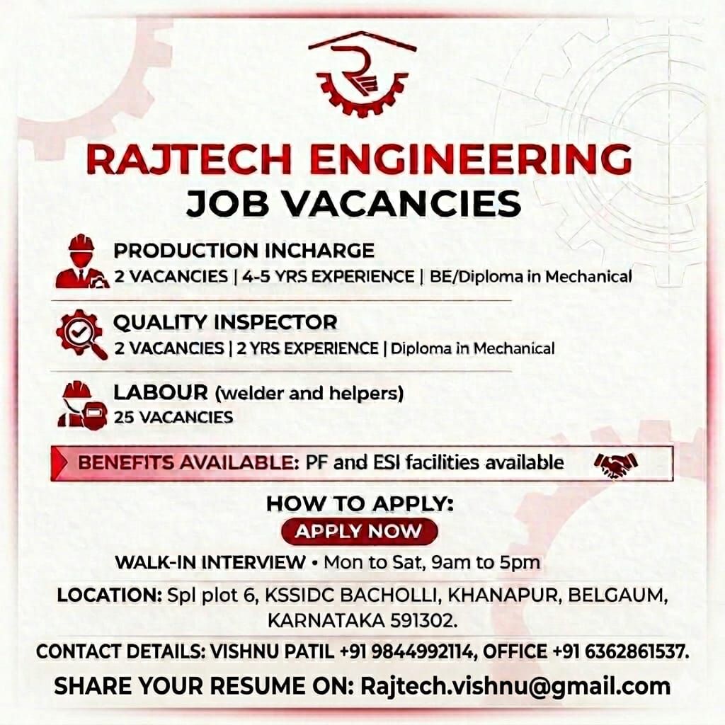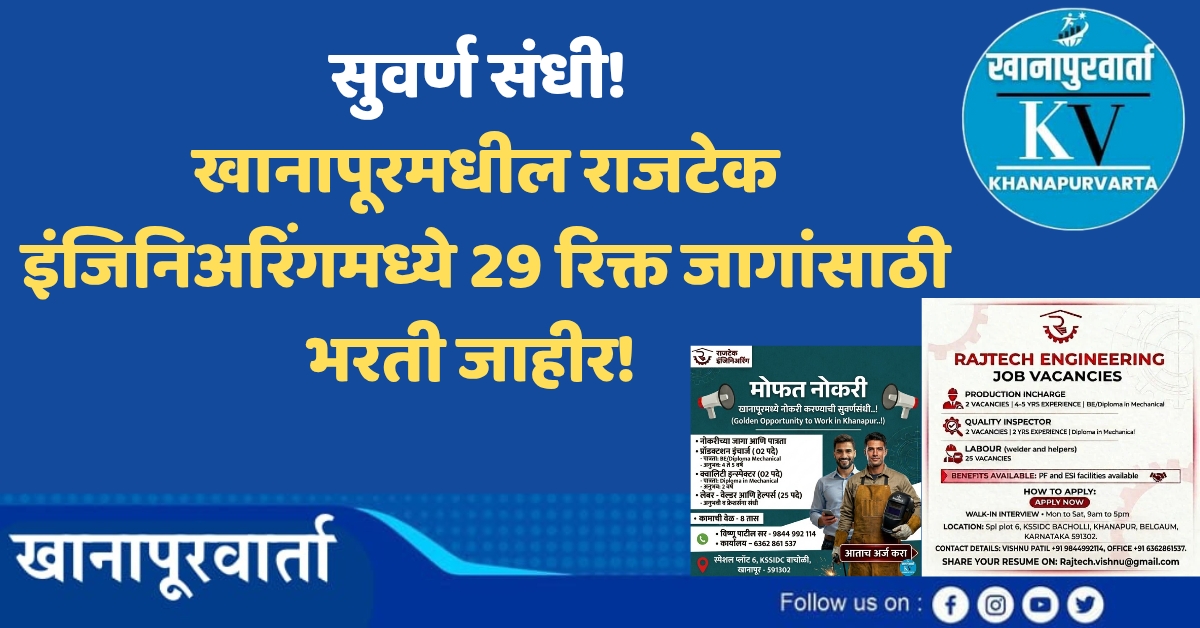 नोकरीची सुवर्ण संधी! खानापूरमधील राजटेक इंजिनिअरिंगमध्ये 29 रिक्त जागांसाठी भरती जाहीर! | ಖಾನಾಪುರ: ಯುವಕರಿಗೆ ಸುವರ್ಣ ಅವಕಾಶ! ‘ರಾಜಟೆಕ್ ಇಂಜಿನಿಯರಿಂಗ್’ ಸಂಸ್ಥೆಯಲ್ಲಿ ವಿವಿಧ ಹುದ್ದೆಗಳಿಗೆ ನೇಮಕಾತಿ