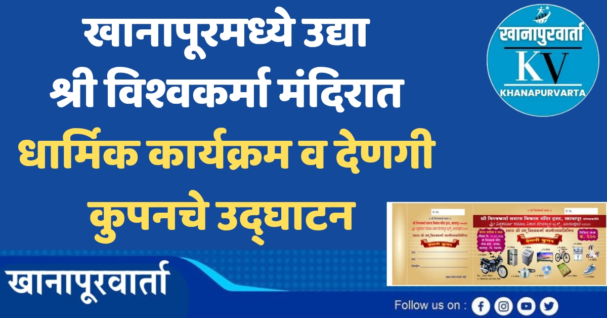 श्री विश्वकर्मा समाज विकास मंदिर ट्रस्ट, खानापूर यांच्या वतीने उद्या, शुक्रवार दिनांक 19 डिसेंबर रोजी अमावास्येनिमित्त श्री विश्वकर्मा मंदिरात धार्मिक कार्यक्रमांचे आयोजन करण्यात आले आहे. या कार्यक्रमाच्या निमित्ताने श्री प्रभू विश्वकर्मा जन्मोत्सवानिमित्त देणगी कूपनचे उद्घाटन करण्यात येणार आहे. यावेळी सकाळी पूजा व अभिषेक, त्यानंतर महाप्रसाद, तसेच भजन कार्यक्रम होणार आहे. या भजन कार्यक्रमात महिला भजन मंडळ, मजगाव सहभागी होणार आहे.