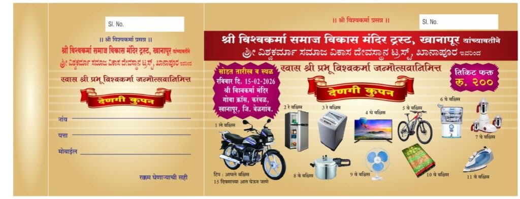दरम्यान, श्री प्रभू विश्वकर्मा जन्मोत्सवाच्या निमित्ताने आयोजित करण्यात येणाऱ्या देणगी कूपनाची माहिती देण्यात आली आहे. या देणगी कूपनाची किंमत फक्त रु. 200 इतकी ठेवण्यात आली असून, या कूपनाच्या माध्यमातून मिळणारा निधी मंदिर व समाजाच्या विकासात्मक कार्यासाठी वापरण्यात येणार आहे. या देणगी कूपन सोडतीचा कार्यक्रम रविवार, दिनांक 15 फेब्रुवारी 2026 रोजी श्री विश्वकर्मा मंदिर, गोवा क्रॉस, करंबळ, खानापूर, जिल्हा बेळगाव येथे होणार आहे. या सोडतीमध्ये पहिले बक्षीस ते अकरावे बक्षीस अशी विविध आकर्षक बक्षिसे ठेवण्यात आली आहेत.